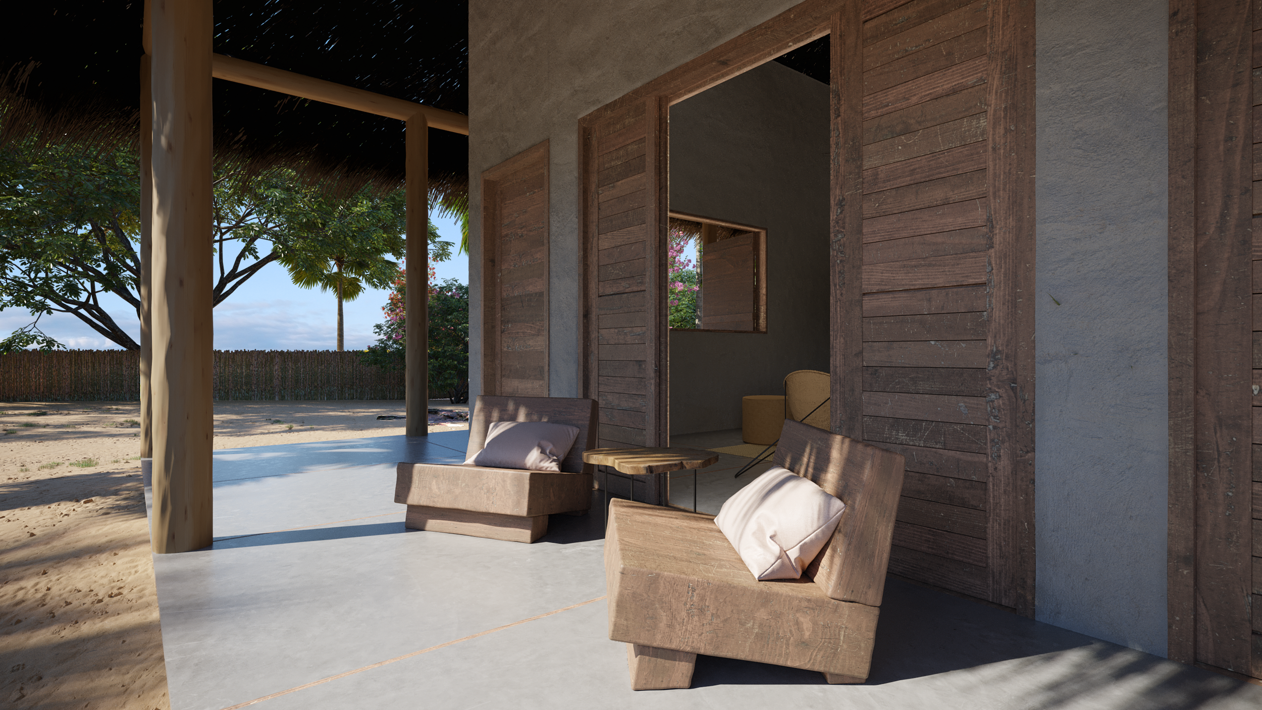 Os principais materiais utilizados foram a madeira bruta para as estruturas e palha de carnaúba para a cobertura, que além de trazerem uma conexão com a paisagem, também trazem a sensação de aconchego.