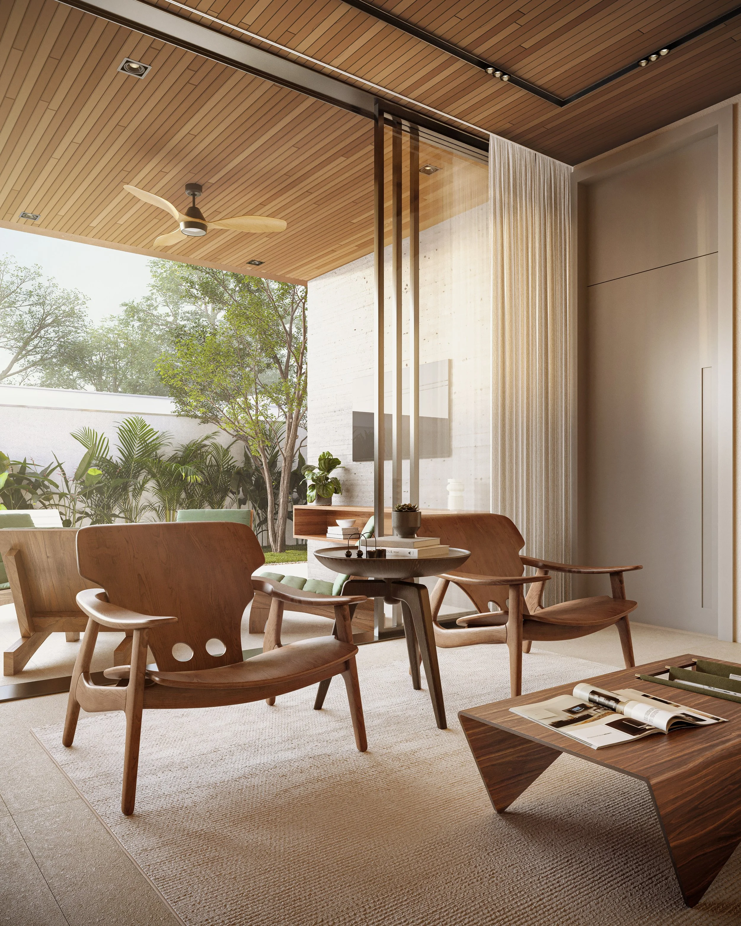 A comunicação entre o dentro e fora é garantida através das amplas esquadrias de vidro, que quando recolhidas, integram a sala à varanda, formando um eixo contínuo. Reforçando esse conceito, os materiais que recobrem o interior são estendidos ao exterior, o granito no piso e o forro ripado em madeira. O sentido das réguas direciona o olhar dos usuários à panorâmica. Esses ambientes se beneficiam do uso de materiais tradicionais modernistas, como madeira e concreto, amplamente utilizados.