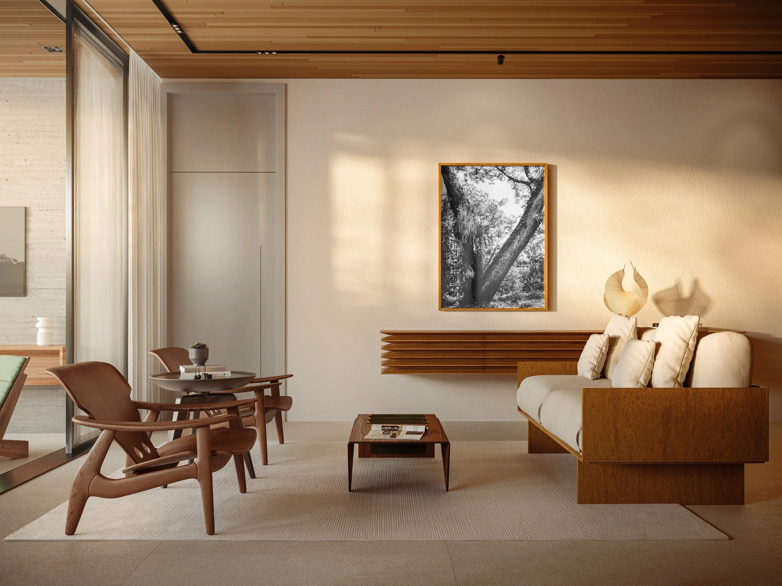Para as áreas sociais criamos uma sensação de acolhimento e conforto, em um espaço aberto, localizado no centro da casa, sem qualquer interferência estrutural na organização dos móveis escolhidos com muito critério e cuidado.